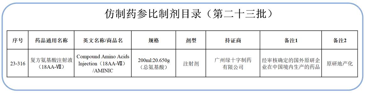 2020年1月7日,国家药监局发布了第二十三批仿制药参比制剂目录,我司绿支安【复方氨基酸注射液(18AA-VII)】权威入选。
